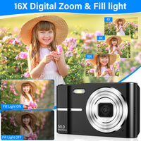 - 50MP and 1080P FHD: This digital camera supports up to 50MP image resolution and 1080P FHD video resolution, allowing you to recreate the most realistic scenes, take high-quality photos or videos and capture unforgettable moments.